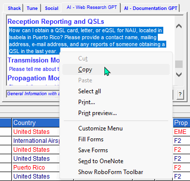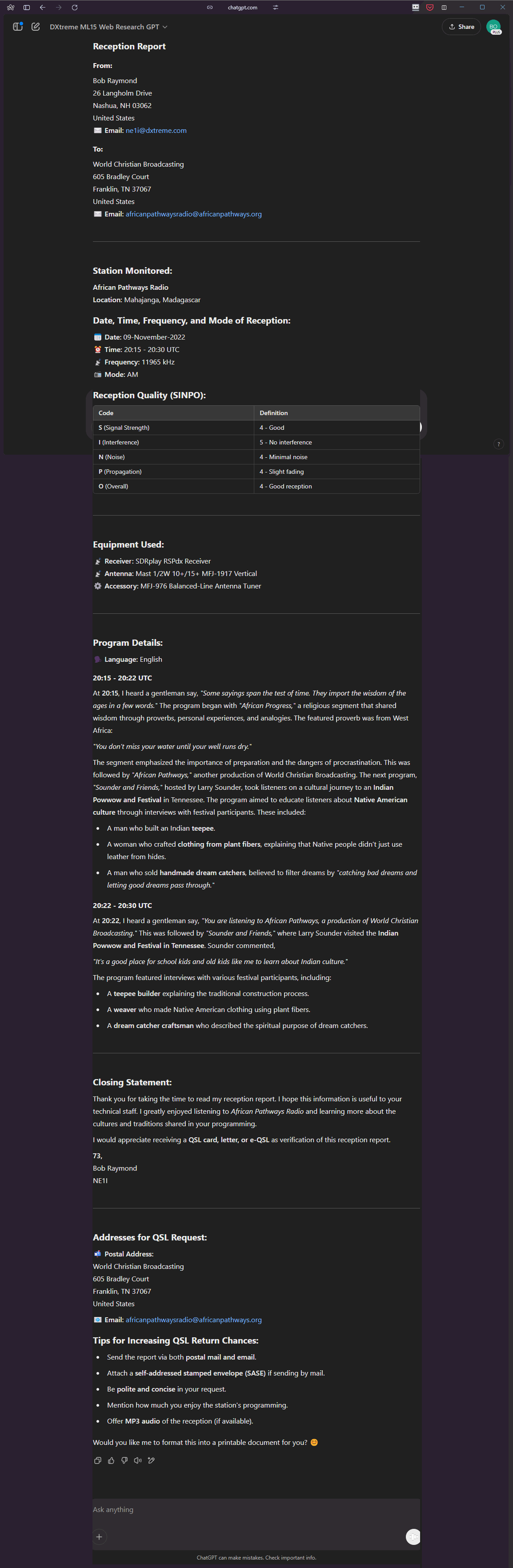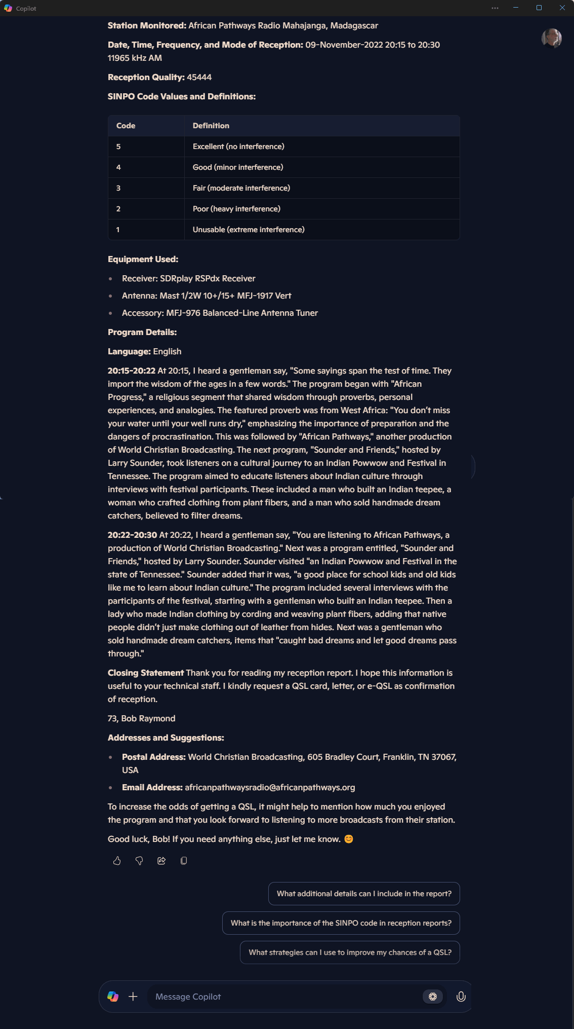 Pretty darn good, we'd say! Congratulations, Copilot! Other prompts may or may not yield similar results. Another Example: DXtreme Monitor Log Web Research GPT Versus Microsoft Copilot Let's try a reception report! After typing program details on the Content tab of Monitor Log 15, we created a prompt containing the appropriate reception report boilerplate text and log variables. The AI - Web Research GPT Tab did the rest by populating the log variables with live data from the Monitor Log window, making the prompt ready for use. We pasted the prompt into DXtreme Monitor Log Web Research GPT, and after clicking the Send button, we received this reception report, suitable for copy-and-pasting into a text editor or e-mail client for sending via snail- or e-mail: