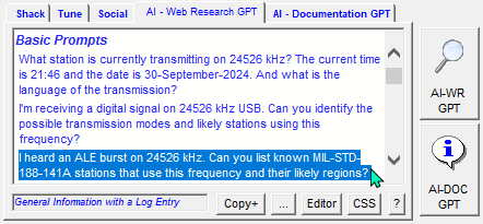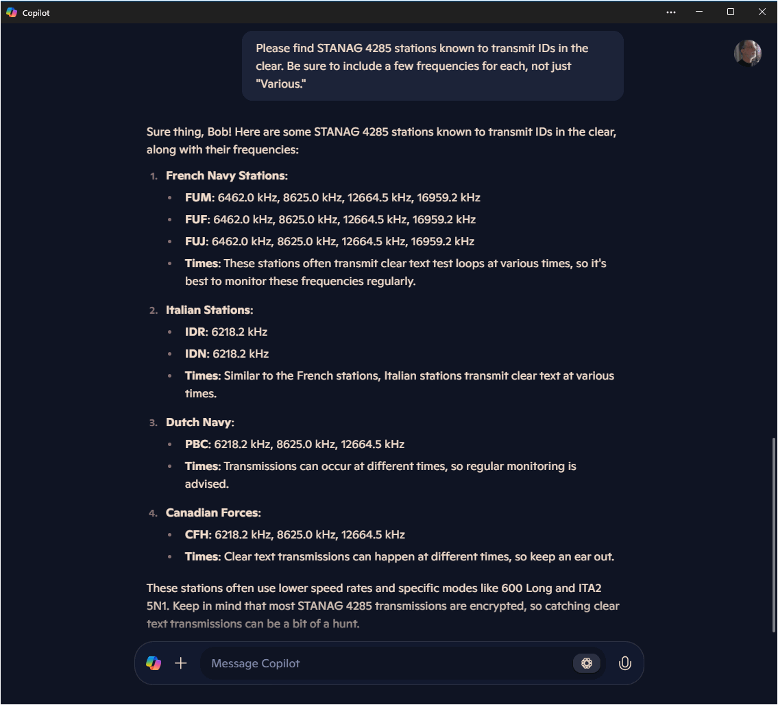 Refer to the OpenAI ChatGPT Product page at https://www.openai.com for more information. Using AI - Web Research GPT Tab Prompts with a Base-Level, Non-Custom GPTAI - Web Research GPT tab prompts can be used secondarily with non-custom GPTs, such as base-level ChatGPT or base-level Microsoft Windows Copilot. The difference is in the results. For example, we typed this prompt directly into our custom DXtreme Monitor Log Web Research GPT: Please find STANAG 4285 stations known to transmit IDs in the clear. Be sure to include a few frequencies for each, not just "Various." We received this response from our Custom GPT: