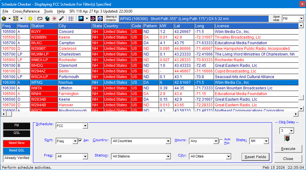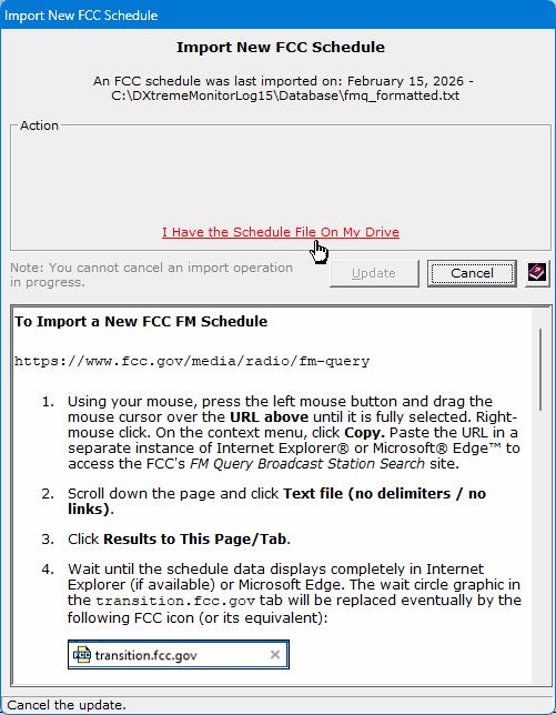Schedule Checker EnhancementImport and Use FCC AM Schedules or FCC FM SchedulesIn addition to Aoki, Aoki Userlist, EiBi, and FCC AM schedules, you can now import an FCC FM schedule in place of an FCC AM schedule, and vice versa. In other words, you can import and use only one FCC schedule [AM or FM] at a time. If you maintain recent copies of the AM and FM FCC schedules on your disk drive, it is easily to switch between them by performing these steps: